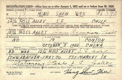 On June 30, 1942 Wee signed his draft card. His San Francisco address was 12 1/2 Ross Alley. He worked at the stationery store, Schwabacher-Frey Company. Wee’s description was five feet five inches, 120 pounds, with brown eyes and black hair.