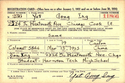 On June 26, 1942 Ing signed his draft card. His address was 2324 South Wentworth Avenue in Chicago, Illinois. He was a student at Harrison Technical High School. Ing was described as five feet inches, 135 pounds, with brown eyes and black hair.